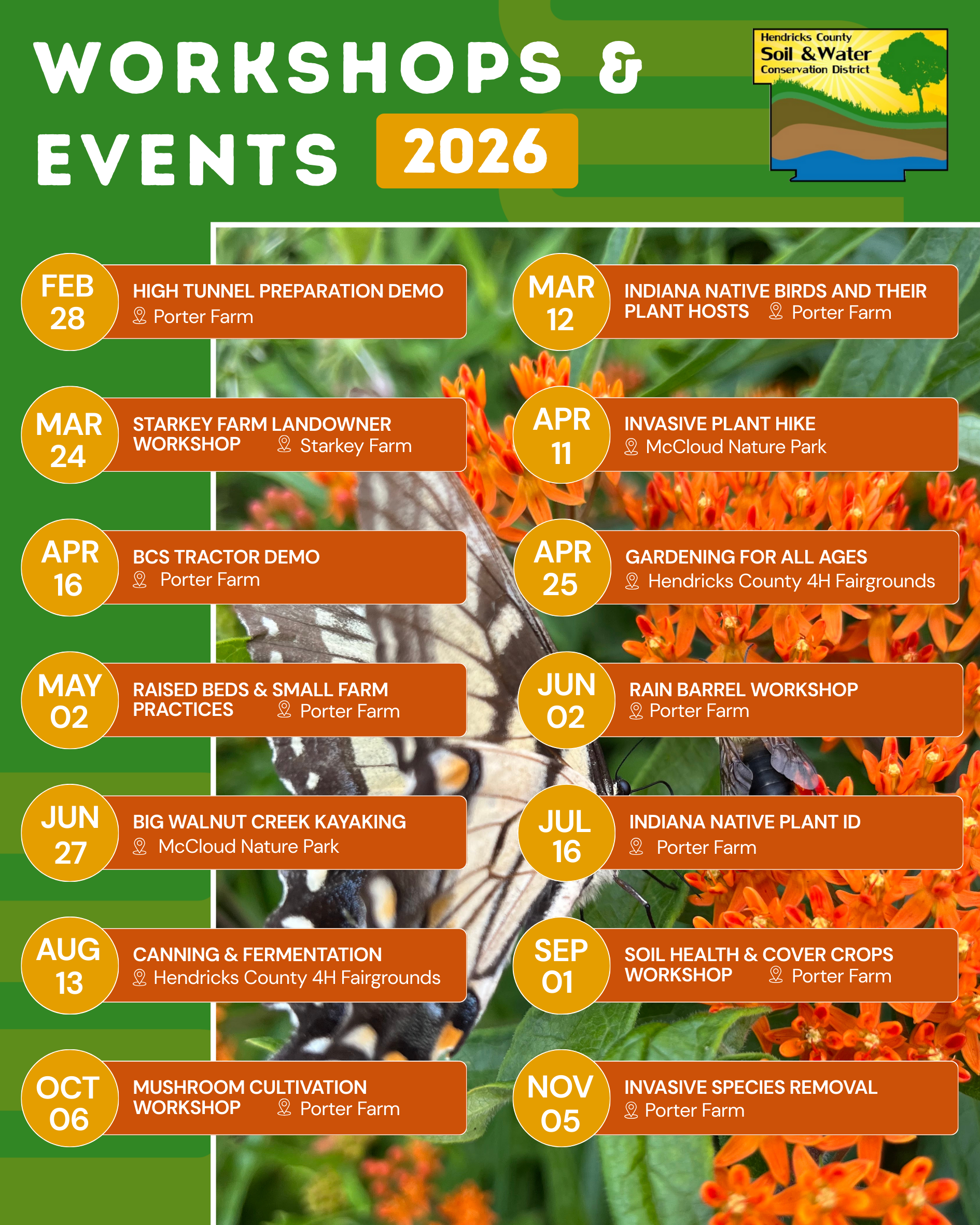 Hendricks County SWCD brings in experts to share their knowledge with county residents and promote sustainable land use. Our workshops are suited for anyone who cares for land, whether you have a farm or a small backyard. Previous workshops have included composting, native species gardening, canning, and rain barrels. The 2025 season has come to a close, but workshops will resume in 2026.